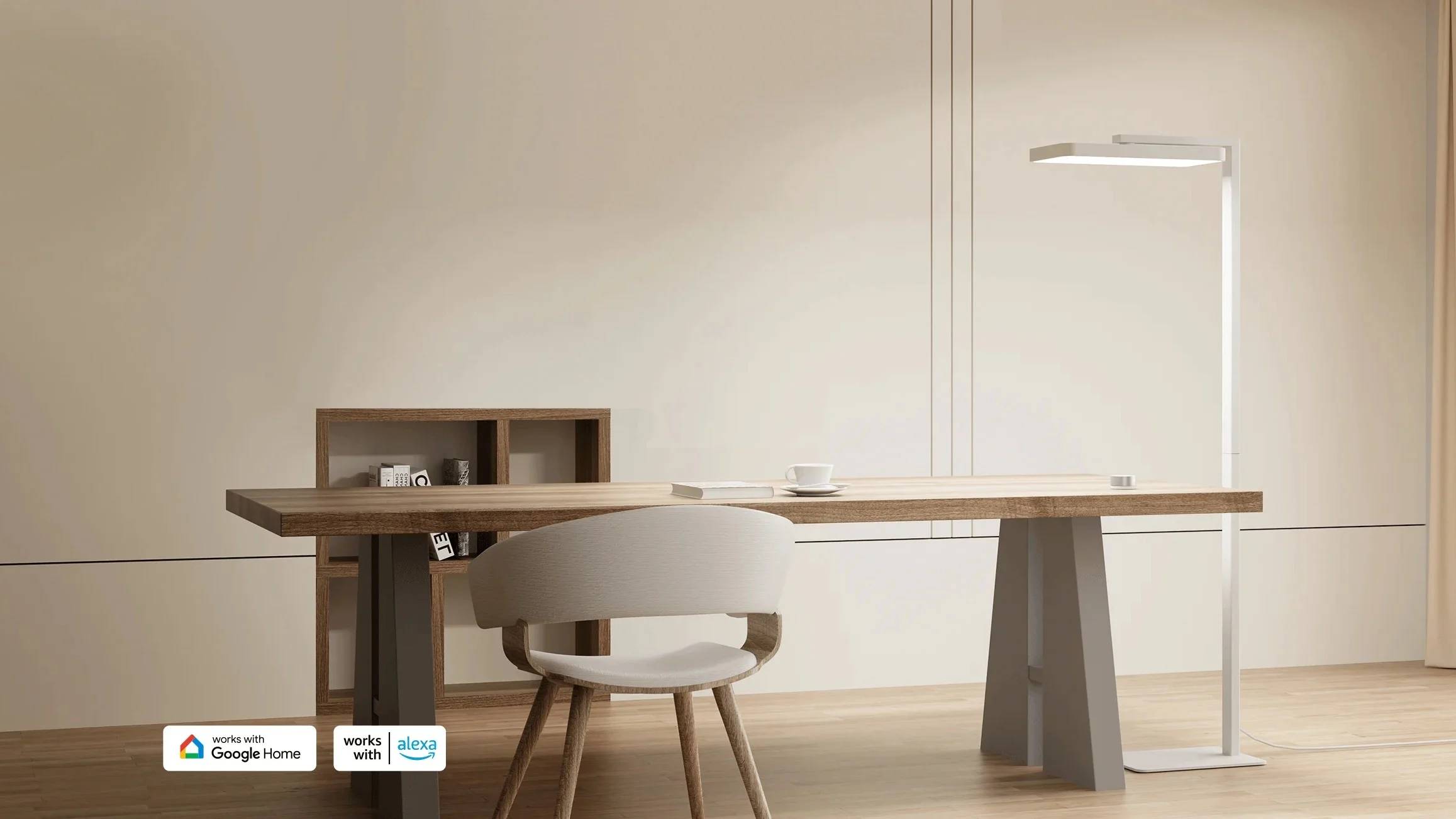 A diferencia de la lámpara de escritorio, la Smart Floor Lamp ofrece dos fuentes de luz montadas en un cabezal giratorio. La fuente de luz superior, de 7.00 lm proporciona iluminación indirecta de 360 grados al reflejar la luz del techo en todas las direcciones. Por otro lado, la fuente inferior cuenta con 3.000 lm para iluminación de estudio.